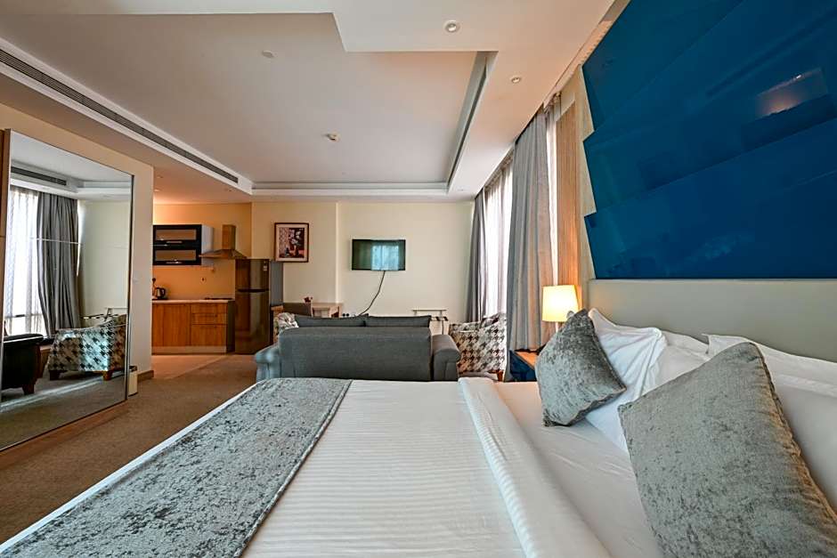 Boasting a private entrance, this air-conditioned suite includes 1 living room, 1 separate bedroom and 1 bathroom with a walk-in shower and slippers. The suite's kitchenette, which has a stovetop and a refrigerator, is available for cooking and storing food. The suite offers a flat-screen TV with cable channels, a washing machine, a tea and coffee maker, a seating area as well as city views. The unit has 1 bed.